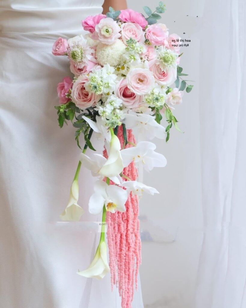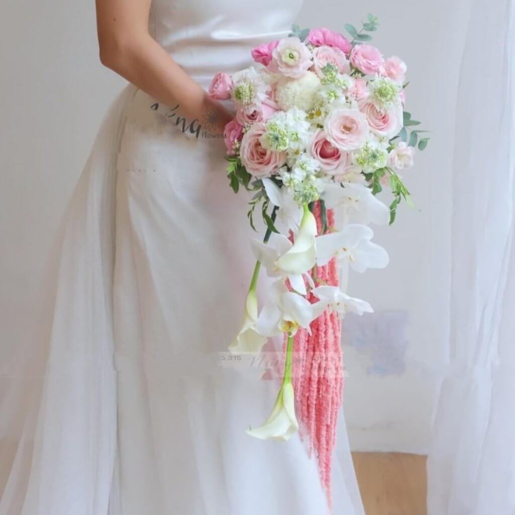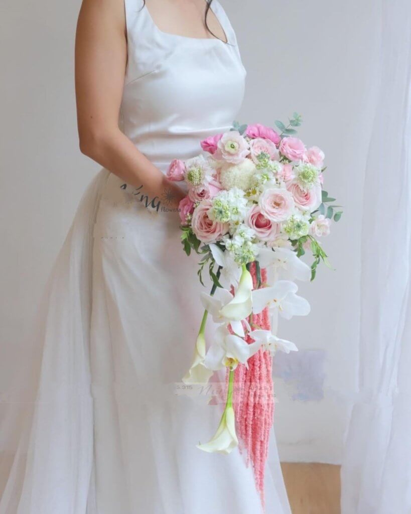 Với cách thiết kế các nhánh hoa dài và lá rủ xuống mềm mại, cầm trên tay bó hoa cưới dáng dài tự nhiên, thác đổ, dáng suối sẽ giúp cô dâu cảm thấy thoải mái, mang đến những bước di chuyển nhẹ nhàng, bay bổng, thướt tha khiến mọi người đều phải dõi nhìn.