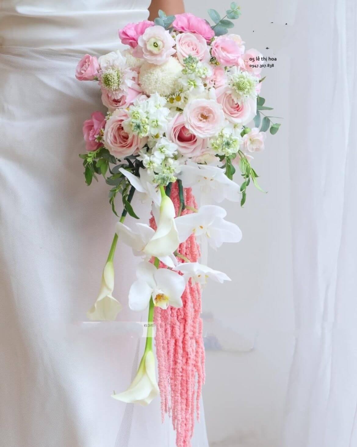 - Hoa cưới dạng thác nước: Dạng thác nước có chiều dài hơn, cánh hoa rủ tự nhiên, tạo cảm giác lãng mạn. Phù hợp với người dáng cao, dáng người tròn trịa và dáng người đồng hồ cát.