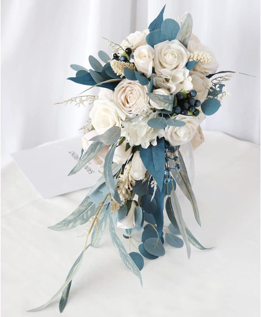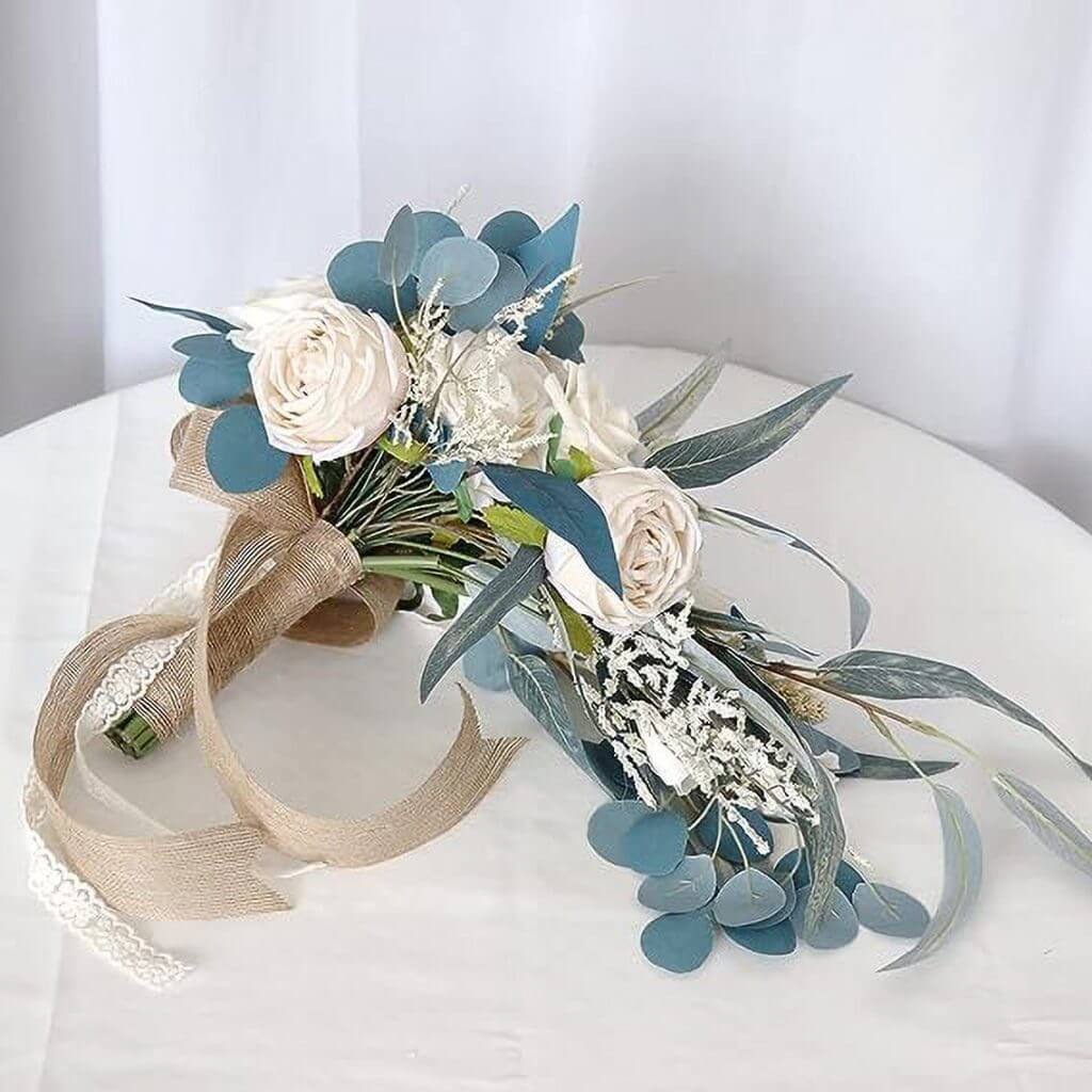 – Lá bạch đàn: Đây là loại lá dài xanh tự nhiên được dùng để tạo điểm nhấn về độ rủ tự nhiên, tạo sự mềm mại của tổng thể thiết kế bó hoa cưới dáng dài.