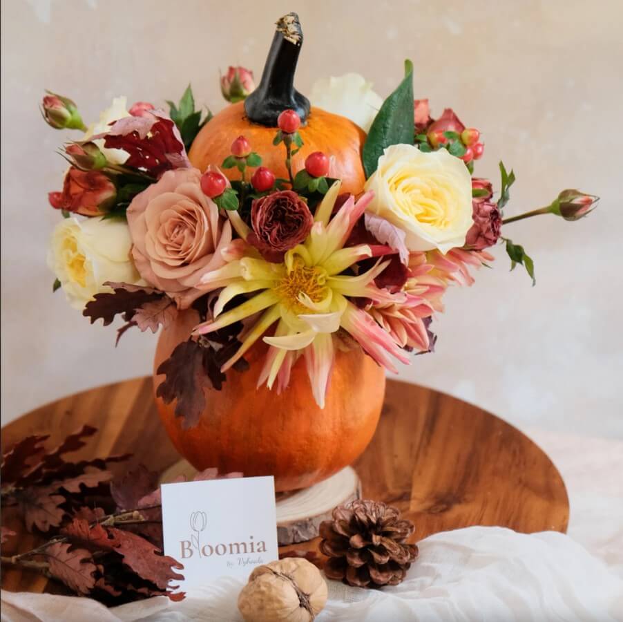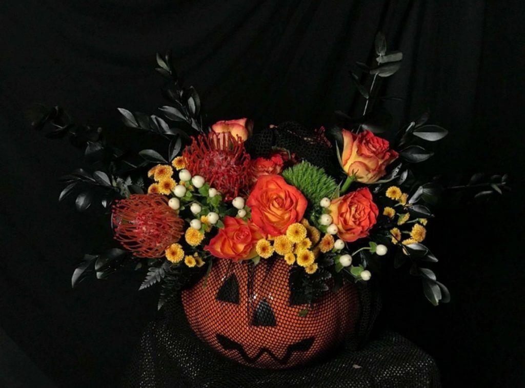 - Trang trí Halloween trái cây mà cụ thể là các mẫu hoa kết hộp cùng bí ngô. Bí ngô có thể được các người thợ cắm hoa khéo léo tạo thành một chiếc bình rồi thêm phần xốp cắm vào trong ruột tạo lớp đệm và cắm hoa như bình thường. Những mẫu hoa Halloween kiểu này thường mất thời gian ít nhất từ 2 – 3 tiếng để xử lý nên sẽ cần đặt trước.