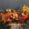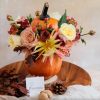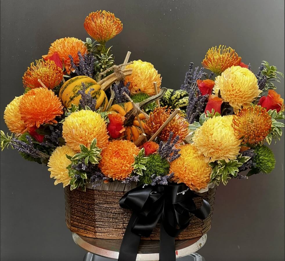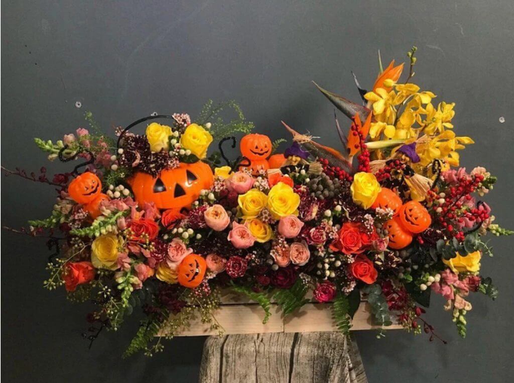 - Các lẵng hoa tươi từ hoa cúc vàng, hướng dương, đồng tiền, hồng cam,… Đi kèm với hoa tươi thường sẽ có các loại lá khô trang trí hay những vật phẩm nhỏ nhắn như quả bí ngô nhựa, cây kẹo, mũ phù thủy, tạo hình những chú ma nhỏ dễ thương.