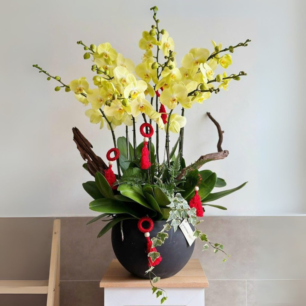 Từng cánh hoa khoe sắc không chỉ là sự phô diễn của vẻ đẹp tự nhiên, mà còn là lời nhắn gửi yêu thương thầm lặng, thay cho những điều khó nói thành lời. Trong đó, sự hiện diện của hoa lan hồ điệp vàng chính là điểm nhấn rực rỡ nhất. Màu vàng tượng trưng cho niềm vui, sự may mắn và thịnh vượng, khiến tổng thể chậu hoa trở nên sang trọng và quý phái.
