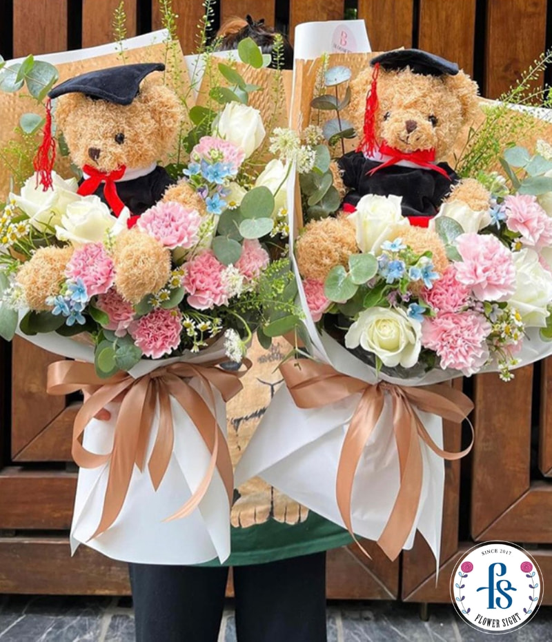 Hoa gấu bông tặng tốt nghiệp là món quà độc đáo và ý nghĩa, kết hợp giữa vẻ đẹp của hoa và sự dễ thương, ấm áp của gấu bông. Đây không chỉ là lời chúc mừng cho thành tựu học tập mà còn thể hiện sự quan tâm, động viên và hy vọng người nhận sẽ có một khởi đầu mới suôn sẻ.
