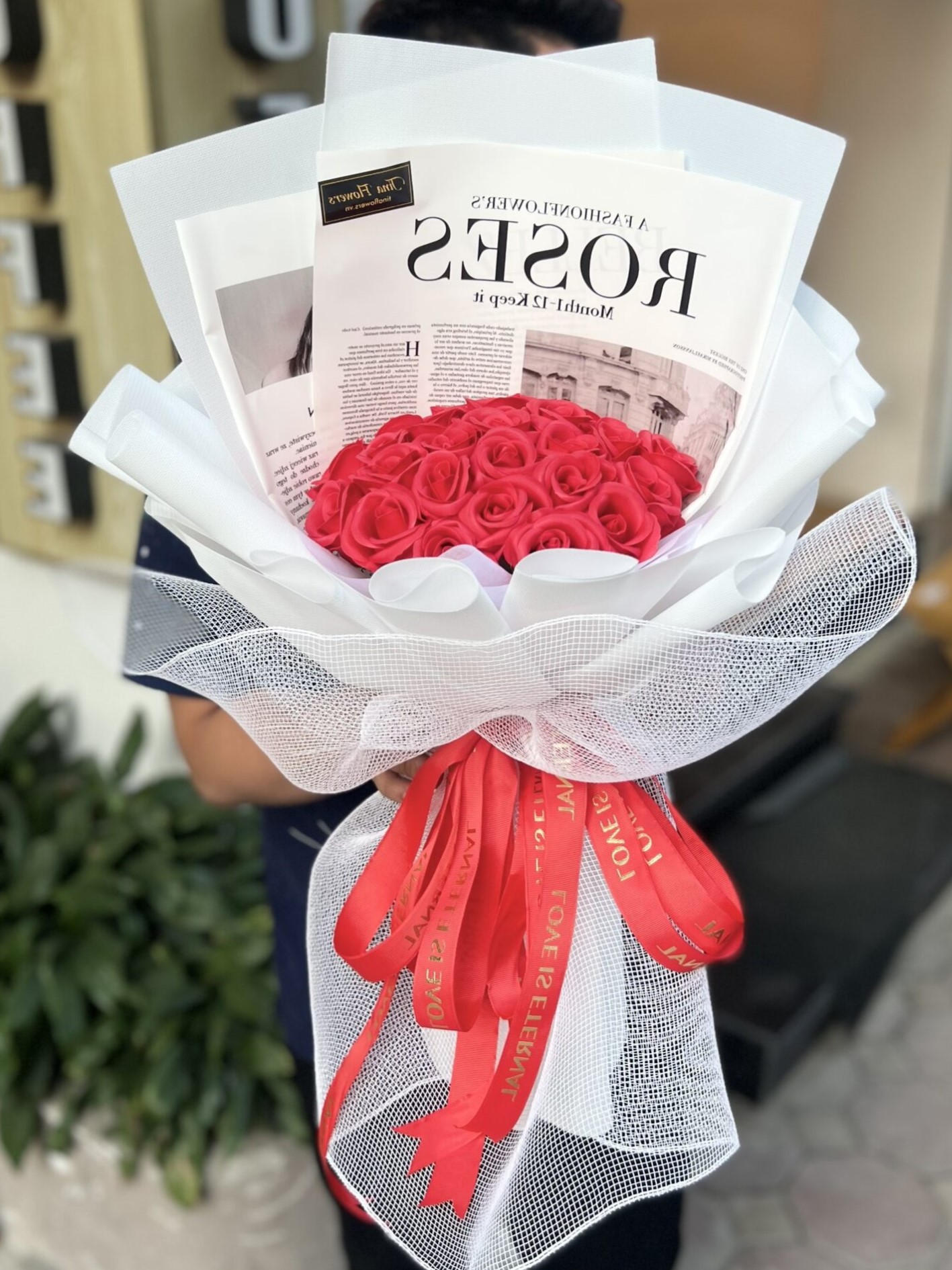 Bó hoa sáp thơm 4 lớp tại FlowerSight được bó gói cẩn thận, sắp xếp đều nhau vô cùng cẩn thận. Bên ngoài bọc lớp giấy báo và thắt nơ nữ tính. Bó hoa được FlowerSight thiết kế và trang trí theo phong cách hiện đại, dịu dàng và nữ tính.