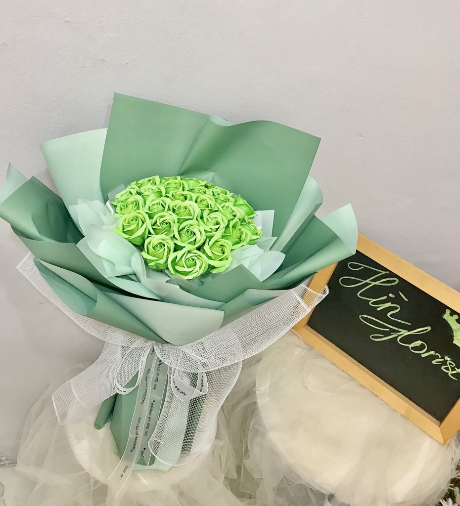 Khác với những bó hoa sáp màu hồng, màu đỏ, hoa sáp thơm màu xanh lá cây phù hợp để tặng cho bạn bè, người thân hoặc trang trí không gian.