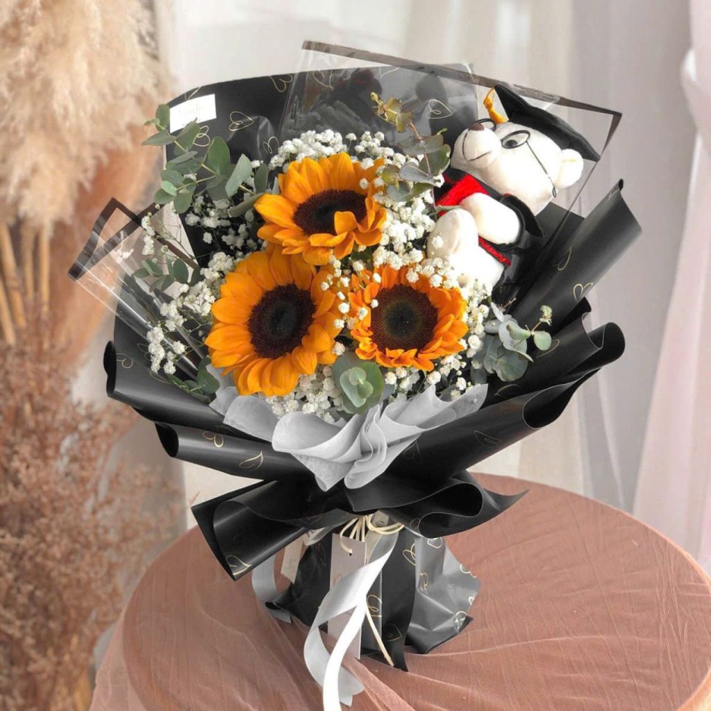 Bó Hoa Gấu Bông Hoàn HảoĐể làm dịu sắc độ rực rỡ của hướng dương, lớp tana mịn màng được rải như một lớp sương nhẹ, phủ đều mép bó và tạo cảm giác bồng bềnh. Cát tường chen nhẹ giữa các cụm hoa, lớp cánh mỏng và độ chuyển màu tinh tế mang lại nhịp điệu mềm. Sự đan cài giữa ba chất liệu hoa giúp tổng thể vừa có nhịp mạnh của hướng dương vừa có khoảng thở êm từ cát tường và tana.