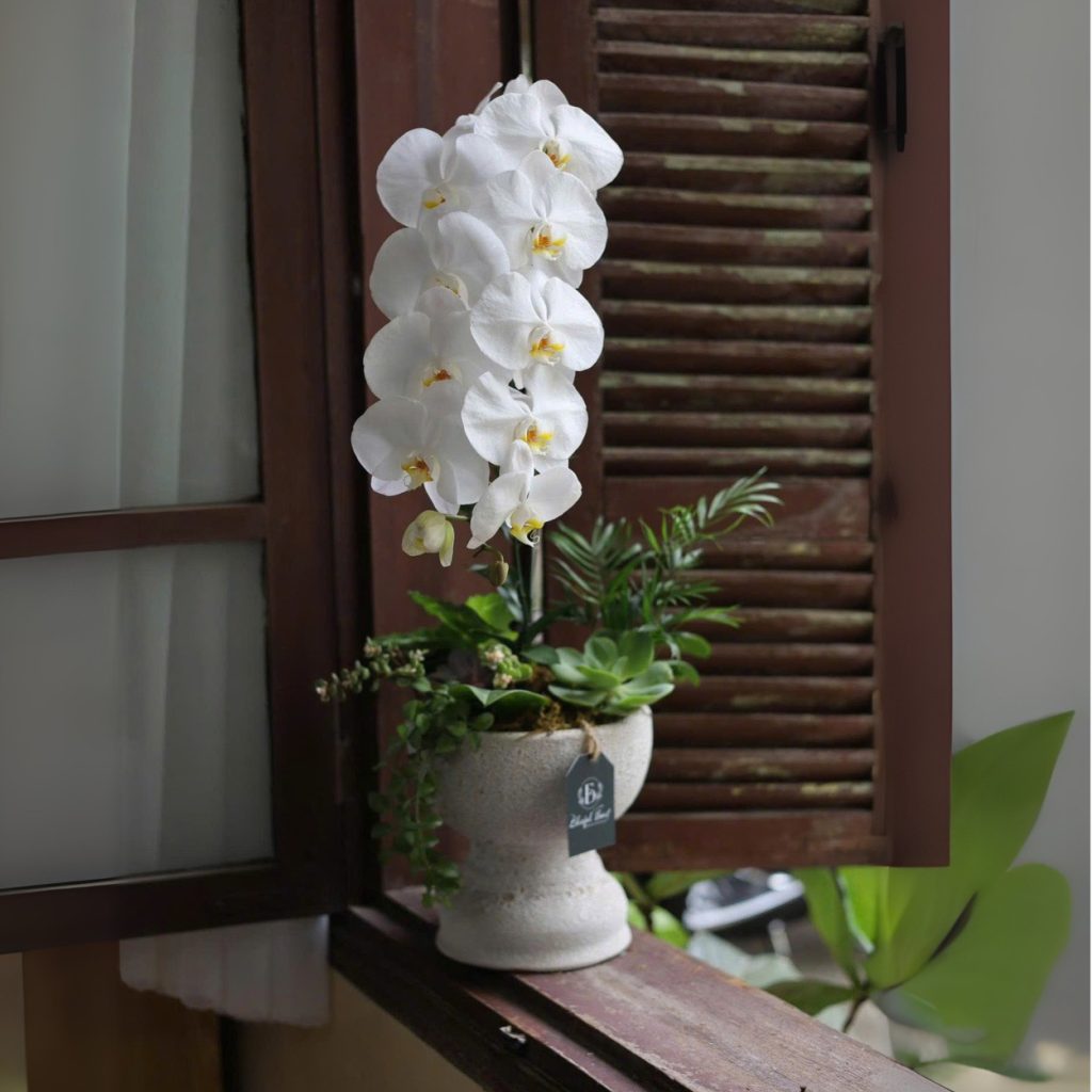 Hồng Phúc là biểu tượng của sự bình an và niềm vui giản dị. Màu trắng tinh khôi của lan hồ điệp kết hợp cùng sắc xanh tươi mát từ dương sỉ và sen đá tạo nên cảm giác nhẹ nhàng, thư thái. Mỗi chi tiết đều được bố trí cân đối, giúp chậu lan hồ điệp 6 cành trở thành tâm điểm trong không gian mà không cần thêm nhiều phụ kiện cầu kỳ.