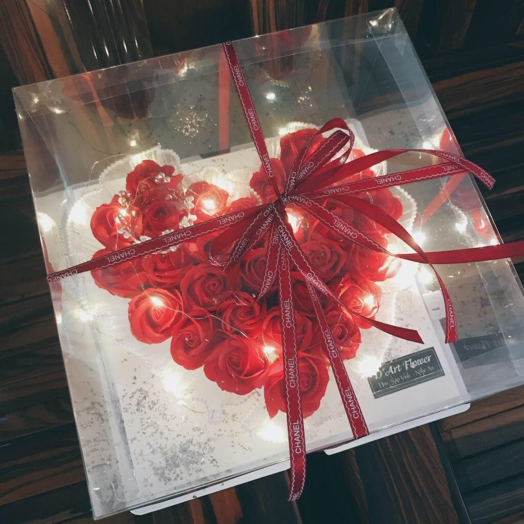 Hộp hoa có đèn gần đây rộ lên như một món quà đặc biệt, mang nhiều ý nghĩa cũng như thể hiện tấm lòng chân thành của người con trai. Sản phẩm sử dụng hoa sáp bên trong để tăng thêm phần cứng cáp và giữ form được đẹp hơn. Số lượng hoa càng nhiều thì hộp hoa càng đẹp và càng lộng lẫy.