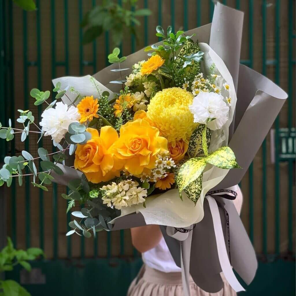 Bó hoa Hot Romance nổi bật với sự kết hợp giữa các loài hoa tươi đẹp và màu sắc ấm áp. Hoa hồng vàng, biểu tượng của tình yêu mãnh liệt và sự lãng mạn, được chọn làm điểm nhấn trong bó hoa này. Những bông hoa hồng vàng không chỉ mang đến vẻ đẹp quyến rũ mà còn truyền tải thông điệp yêu thương chân thành.