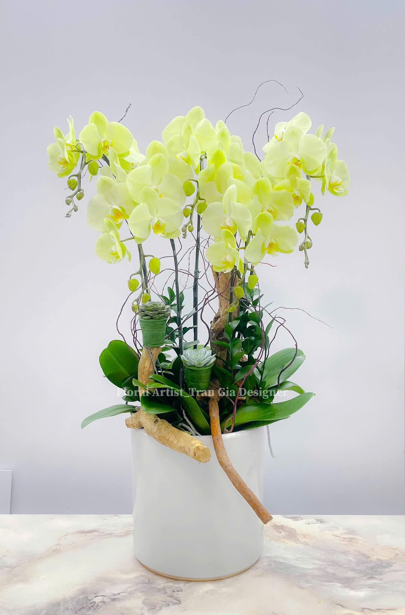 Chậu hoa Hương Lan là sự kết hợp khéo léo giữa các yếu tố thiên nhiên và nghệ thuật cắm hoa hiện đại. Lan hồ điệp xanh nhạt – loài hoa hiếm và thanh lịch – được chọn làm trung tâm, đại diện cho sự bình yên, trí tuệ và sự sống tĩnh tại.