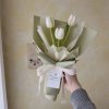 Ba bông tulip trắng đứng thẳng như những ngọn nến – đó là ấn tượng đầu tiên khi bạn chạm mắt “Iphigenia”. Sắc trắng tinh khôi làm chủ đạo, được đặt giữa lớp giấy gói hai tầng xanh olive – kem dịu và hoàn thiện bằng chiếc nơ lụa màu ngà. Tổng thể nhỏ gọn, sáng sủa, gợi cảm giác an yên của một buổi sáng trong trẻo: chỉ cần đặt cạnh cửa sổ, ánh sáng chạm khẽ là bó hoa đã “thở”.