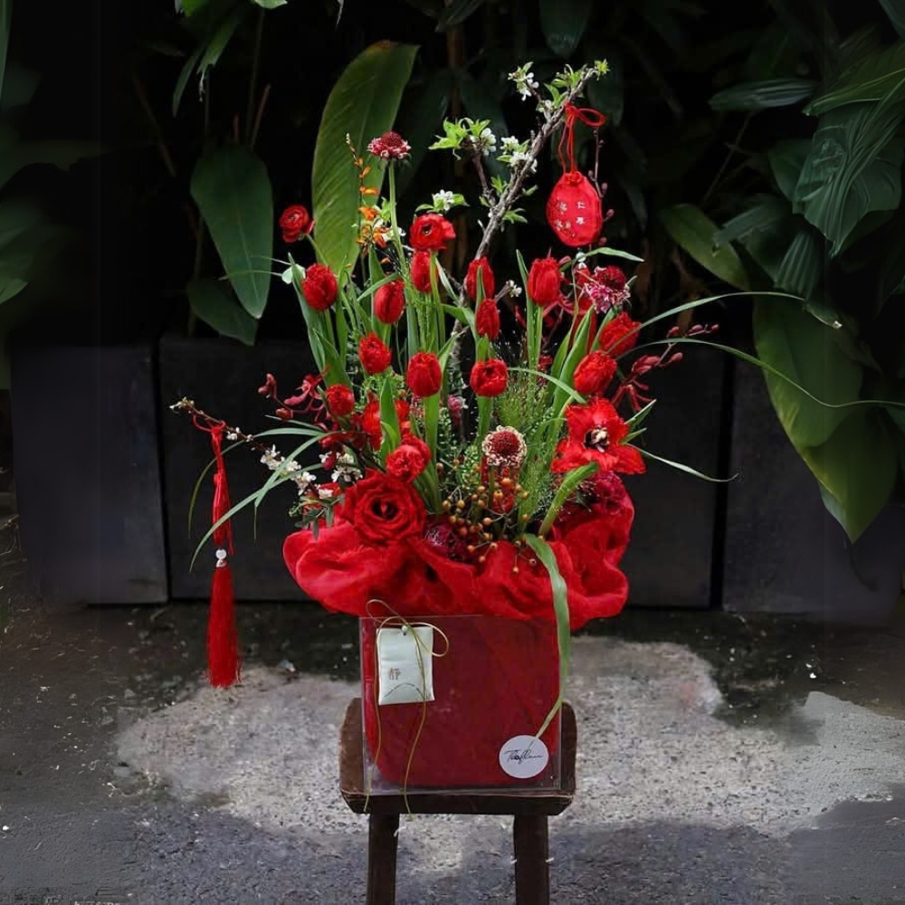 Giỏ hoa “Jasmine” là sự kết hợp giữa những bông tulip kiêu kỳ và lan hồ điệp mạ vàng lấp lánh – hai loài hoa biểu tượng cho vẻ đẹp quý phái và tình yêu bền bỉ. Tulip mang nét hiện đại, tinh khôi, còn lan hồ điệp mạ vàng lại toát lên vẻ sang trọng, khiến tổng thể lẵng hoa sinh nhật như được thổi hồn vào từng chi tiết.