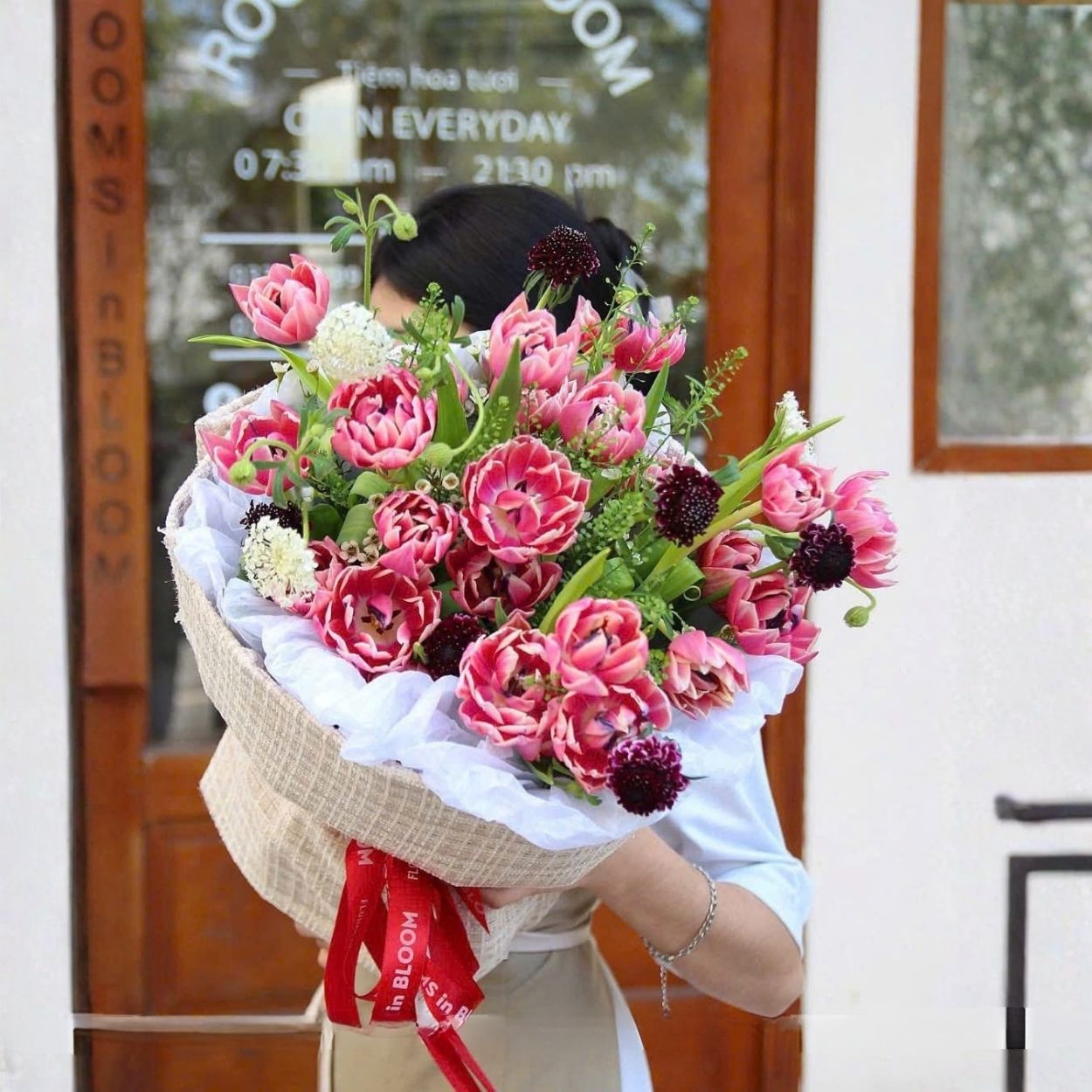 Nguồn tulip được tuyển búp chắc, cánh dày để giữ form lâu; scabiosa chọn đầu tròn, màu trầm đều; cỏ đồng tiền và lá phụ cắt đúng chiều để không che mặt hoa. Giấy gói trung tính có vân nhẹ, tạo bề mặt “thời trang” khi chụp cận, đồng thời chống nhàu tốt. Nơ đỏ satin dệt chữ tạo hiệu ứng cao cấp, buộc kiểu lệch nhằm kéo dài tỷ lệ khối bó khi cầm tay. Tất cả chi tiết đều hướng đến trải nghiệm mở hộp: gọn – sạch – thơm nhẹ và đẹp ngay từ góc chụp đầu tiên.