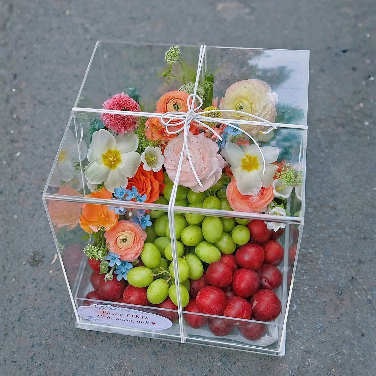 Jolie là kiểu quà “nhìn là yêu”: một khối hộp mica trong veo, cột nơ trắng thanh lịch, bên trong chia làm hai thế giới đối lập mà hòa hợp. Nửa dưới là vườn trái tươi: nho xanh căng mọng đặt cạnh mận đỏ ruby rực rỡ, tạo dải màu tương phản sống động.