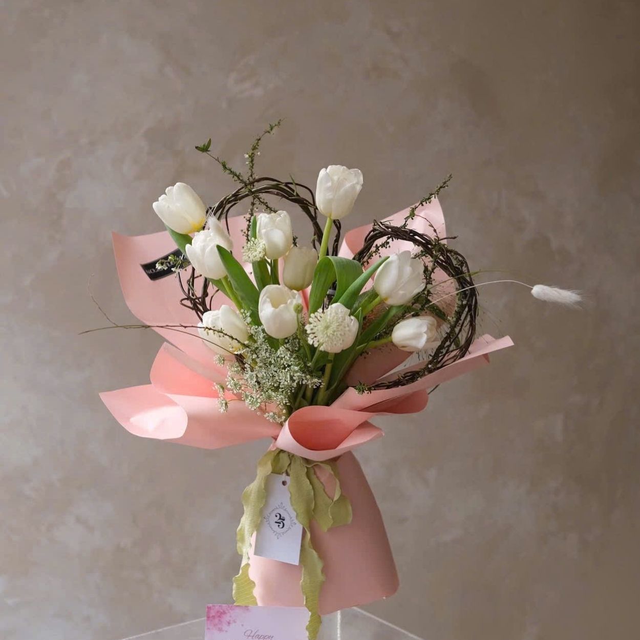 Lấy tulip trắng làm trung tâm, từng bông căng cúp, đường gân lá xanh mướt ôm lấy cánh hoa như một lớp nâng đỡ tự nhiên. Những chùm hoa li ti trắng tạo màn sương mỏng, làm mềm thị giác và đẩy chiều sâu cho tổng thể. Các nhánh cành nâu mảnh được uốn vòng khéo léo, gợi hình trái tim, tạo khung mộc mạc bao bọc lấy cụm tulip ở giữa. Toàn bộ bố cục phân tầng từ thấp đến cao, bông nở và búp non đan cài nhịp nhàng, cho cảm giác đang chuyển động như một hơi thở.