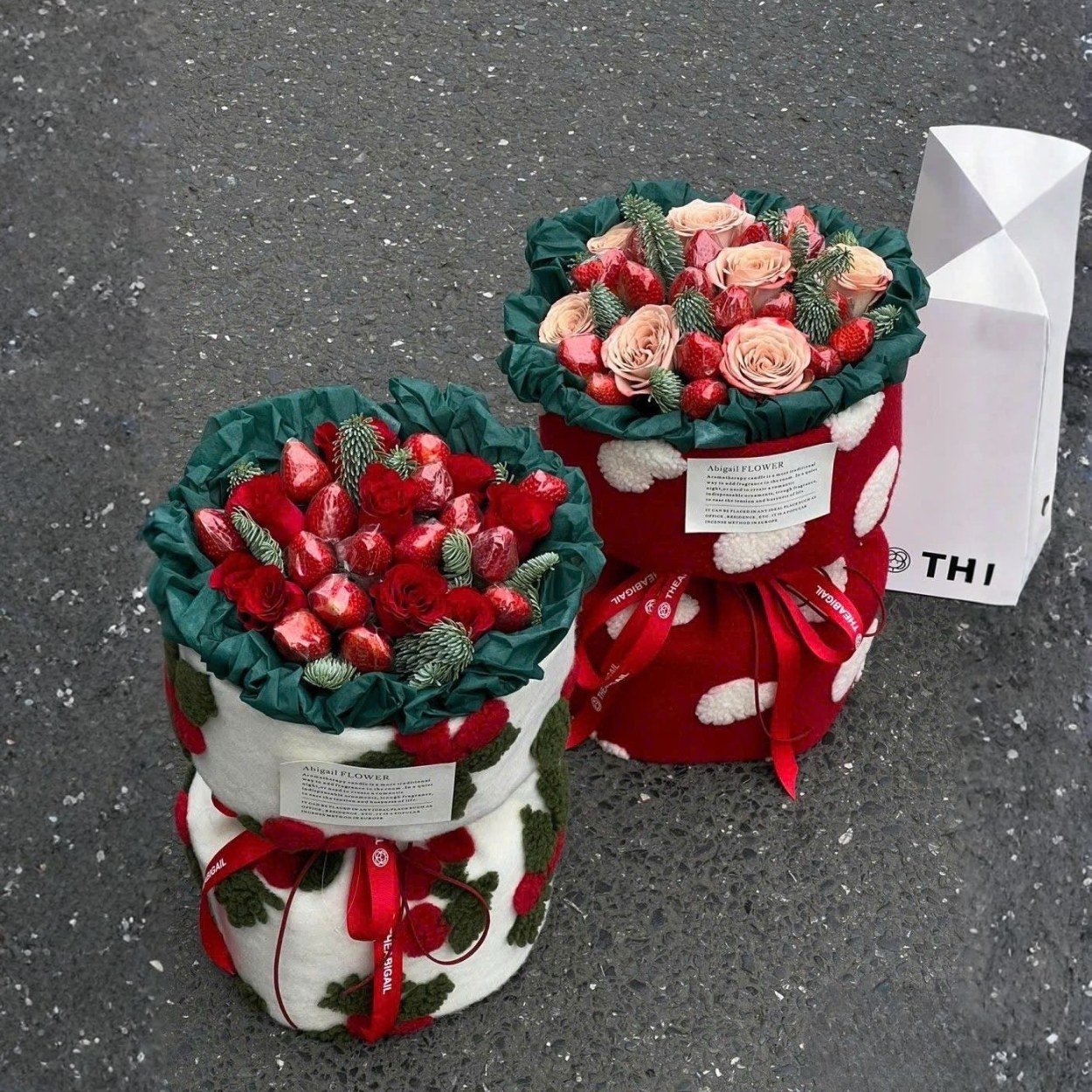 Khi mở nắp “Kapo”, bạn sẽ thấy một khu vườn mini đang nở rộ: dâu tây đỏ mọng phủ sương, hoa hồng kem hồng cuộn cánh, xen kẽ lá phụ xanh rì và đường viền giấy gói màu xanh ngọc được xếp nhún chỉn chu. Tất cả nằm gọn trong chiếc “giỏ” bọc vải đan hoạ tiết chấm bi/hoa cổ điển, thắt nơ lụa đỏ. “Kapo” sinh ra để chiều mắt – chạm cảm xúc – và mang đến khoảnh khắc wow ngay từ cái nhìn đầu tiên.