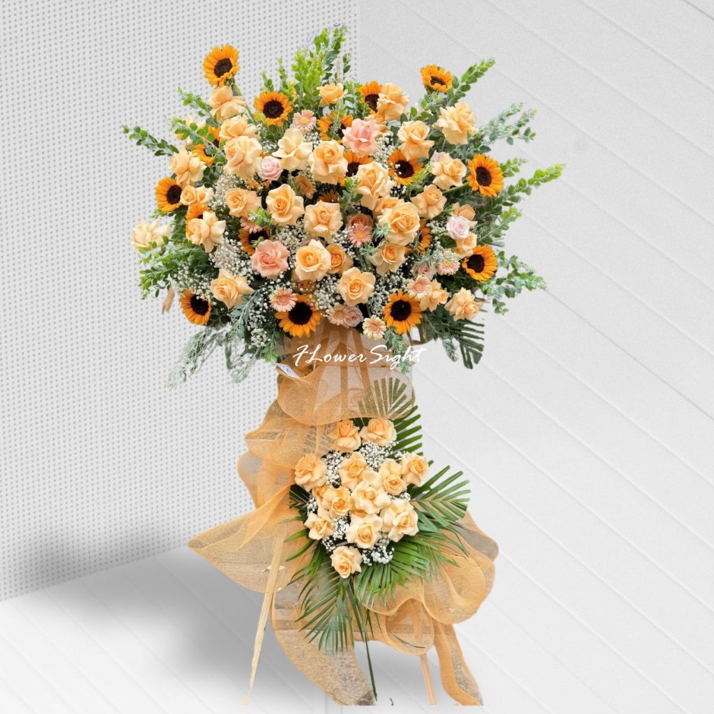 Kệ hoa tươi hướng dương thường có màu sắc chủ đạo là màu vàng hoặc màu cam, 2 màu sắc thông dụng, có thể sử dụng cho nhiều dịp khác nhau. Gợi ý một số lưu ý trong quá trình lựa chọn kệ hoa phù hợp: