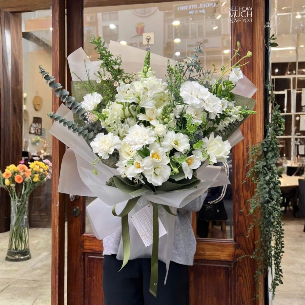 Kerenza không ồn ào. Hương nhẹ, khối hoa rộng nhưng không nặng tay nhờ cách cắm mở tán. Lúc nâng bó, bạn sẽ thấy lớp giấy sương mờ ôm mềm bàn tay – không lục cục, không gãy nếp. Màu trắng tinh khiết đi cùng olive xanh trầm tạo nên bảng màu “calm luxury”: dễ phối trang phục, lên hình đẹp dưới cả ánh đèn vàng lẫn sáng tự nhiên.