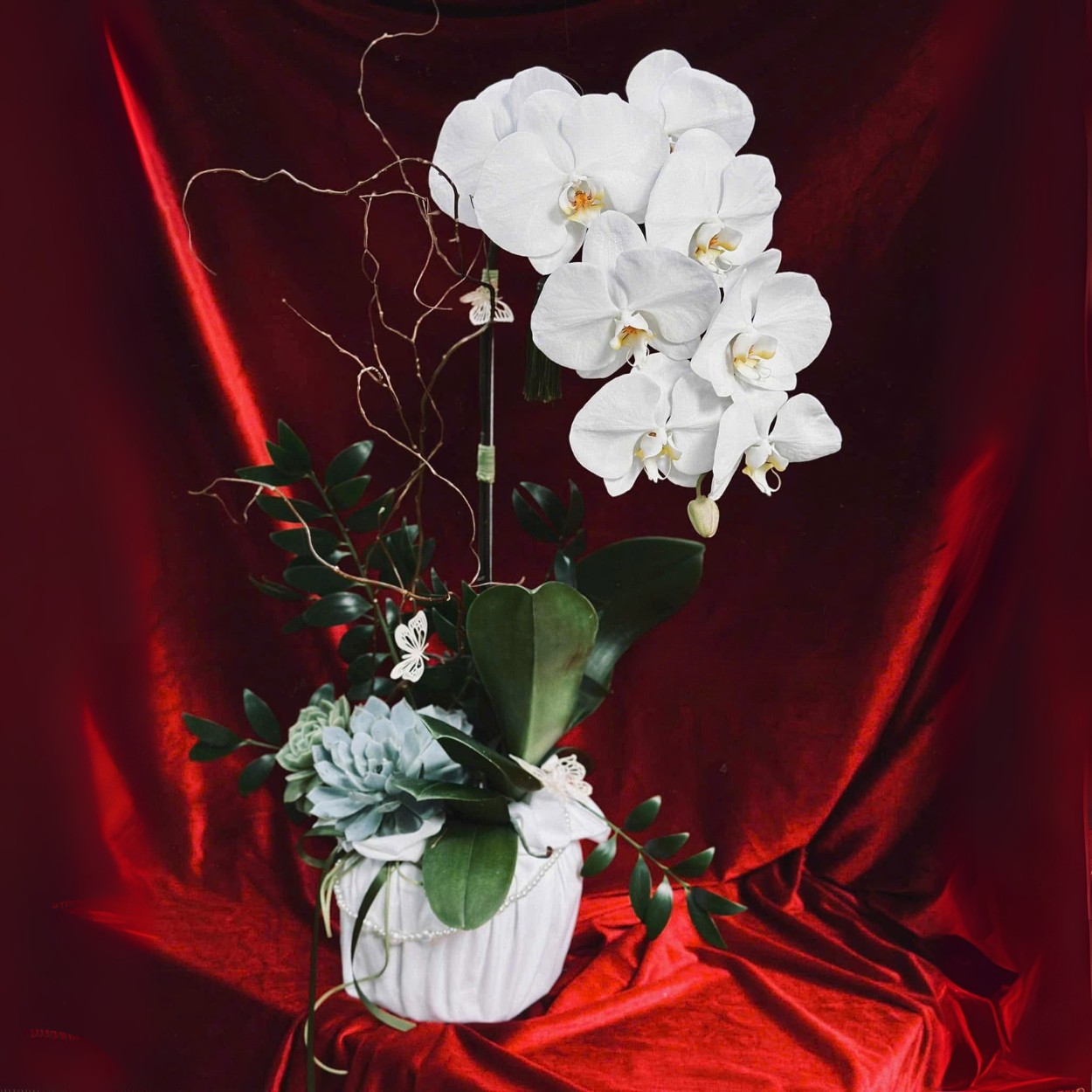 Đây là lựa chọn lý tưởng để gửi gắm lời chúc công việc hanh thông, thu hút tài lộc và mở ra những cơ hội mới. Màu sắc tươi sáng của lan hồ điệp kết hợp cùng sự bền bỉ của sen đá tạo cảm giác thịnh vượng, bền lâu. Chậu hoa mang kích thước vừa phải, dễ dàng bày trí tại quầy lễ tân, bàn tiếp khách hay không gian trưng bày sản phẩm.