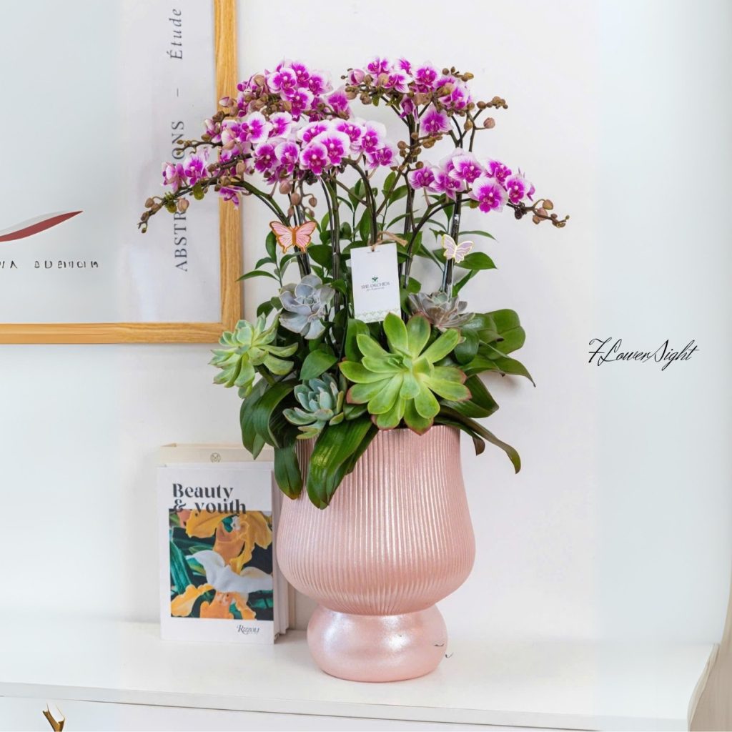 Khai trương phú Quý mang trong mình sự may mắn và thịnh vượng, như một lời cầu chúc đủ đầy cho chặng đường mới. Chậu hoa được thiết kế tinh tế, kết hợp giữa vẻ thanh lịch của lan và sự vững chắc của sen đá. Tiểu hồ điệp điểm xuyết càng làm nổi bật sự mềm mại, hài hòa. Đây chính là sự giao thoa của sang trọng và tự nhiên, thể hiện trọn vẹn tinh thần may mắn.