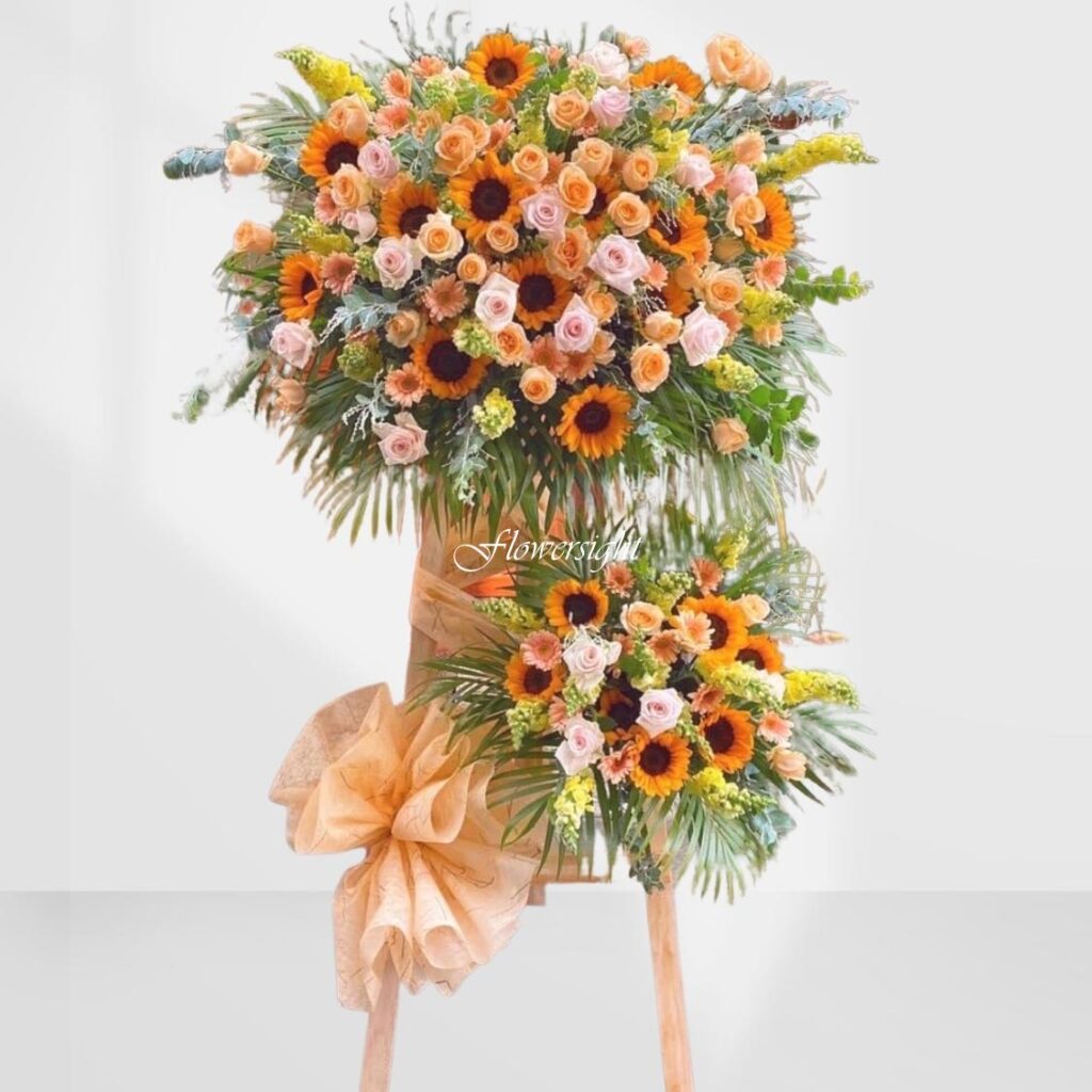 Kệ hoa Khai trương vạn lộc không chỉ gây ấn tượng bởi màu sắc rực rỡ mà còn mang nhiều tầng ý nghĩa đặc biệt. Sự hiện diện của hoa hướng dương chính là hình ảnh biểu trưng cho sự vững chãi, luôn hướng tới thành công. Hồng pastel gợi nhắc sự ngọt ngào trong các mối quan hệ, giúp củng cố lòng tin và tinh thần hợp tác lâu dài giữa các đối tác.