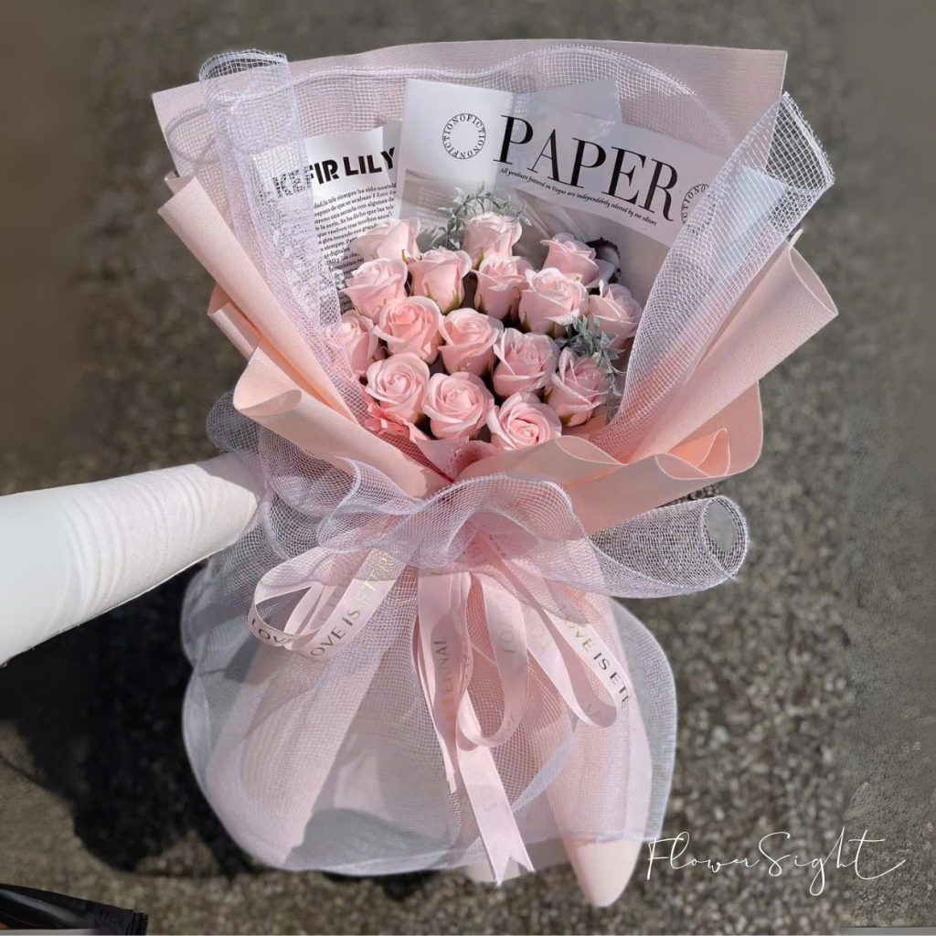 Khúc nhạc như một giai điệu dịu êm, vừa ngọt ngào vừa tinh tế. Sắc hồng pastel của hoa hồng kết hợp cùng giấy gói hồng và lưới trắng trong suốt tạo nên tổng thể nhẹ nhàng nhưng sang trọng. Dây nơ trắng điểm xuyết càng làm bó hoa thêm phần tinh khôi. Món quà này gợi lên cảm giác ấm áp, như một bản nhạc lãng mạn gửi tới trái tim người nhận.