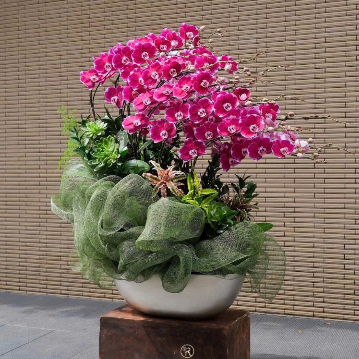 Kim Lan tượng trưng cho sự sang trọng, may mắn và thành công. Sự phối hợp hài hòa giữa lan, lưới xoắn, lá chanh, dương xỉ và sen đá tạo tổng thể bắt mắt, nổi bật nhưng vẫn dịu dàng. Chậu hoa vừa là món quà ý nghĩa, vừa là vật trang trí hoàn hảo cho không gian làm việc hoặc nhà ở.