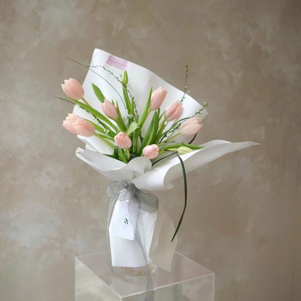 Thành phần chính gồm hoa tulip hồng phấn tuyển chọn, lá tulip mướt xanh, lá phụ dáng chỉ mảnh để tạo nhịp. Lớp giấy gói trắng được xử lý hai tầng, ngoài mờ trong bóng nhằm tăng chiều sâu và giữ phom đứng cho bó.