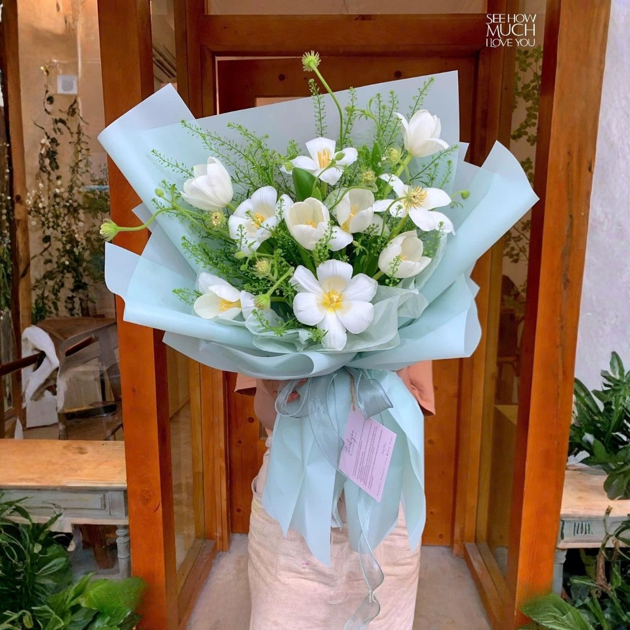 Bảng màu của Là Anh xoay quanh trắng và xanh mint. Giấy gói được chọn loại có độ đứng vừa đủ để tạo nếp sóng, song vẫn mờ nhẹ nên không lấn át cụm hoa. Nơ lụa đồng tông bổ sung ánh mờ nhã nhặn, giữ cho tổng thể liền mạch từ thân bó đến đầu hoa. Sự tương phản giữa nhụy vàng và nền xanh giúp từng cánh tulip như phát sáng, mang cảm giác sạch sẽ, tinh tế và hiện đại trong mọi không gian.