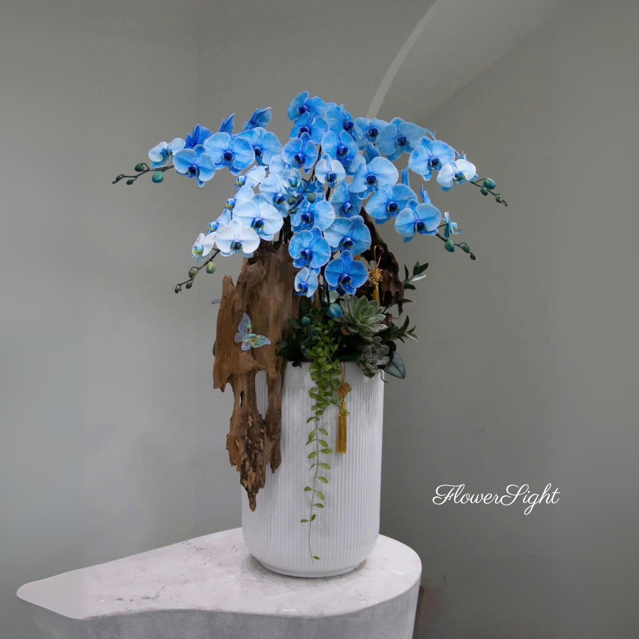 Chậu hoa Lan Cẩm Quỳnh kết hợp lan nhuộm, gỗ, sen đá và dây thường xuân tạo tổng thể hài hòa, trang nhã. Với lan hồ điệp xanh dương, món quà này thích hợp tặng sinh nhật, chúc mừng sếp, trang trí văn phòng hoặc dịp 20/10, gửi trọn vẻ đẹp thanh thoát và ý nghĩa tinh tế.
