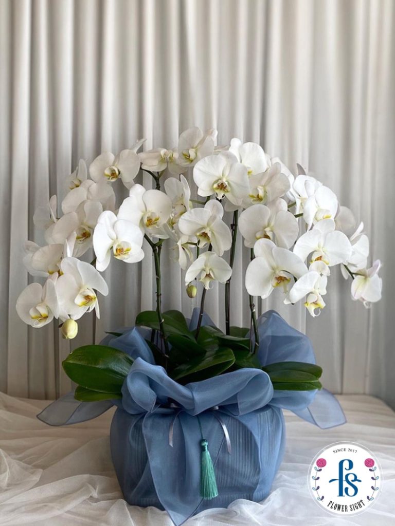 Chậu hoa lan hồ điệp trắng đẹp mặt cho dịp mừng khai trương, lễ tết