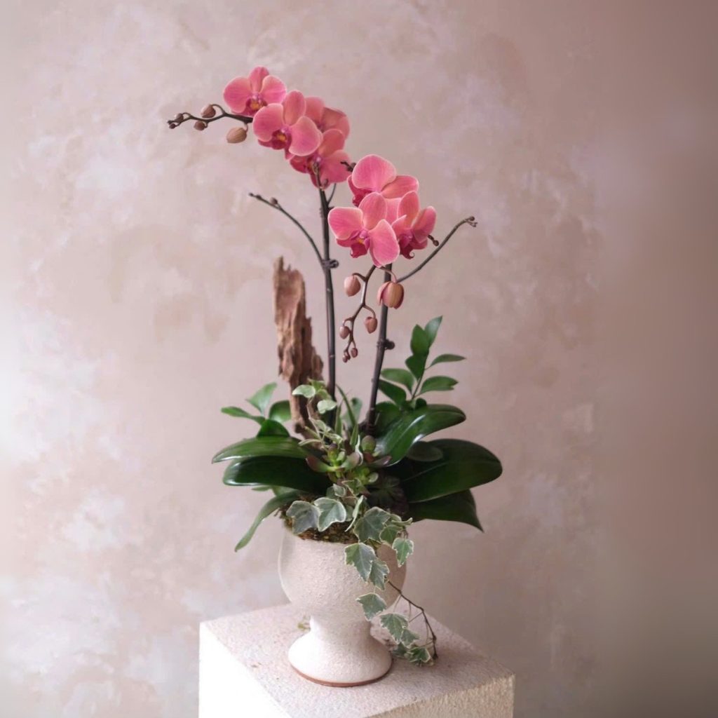 Lan Hồ Điệp Tím Mộng là mẫu chậu lan nhỏ được thiết kế tinh tế với sắc hồng phớt nhẹ, phối hợp cùng dây nho, lũa và lá phụ tạo tổng thể mềm mại. Với kiểu dáng thanh lịch và bố cục cân đối, chậu lan 2 cành này thích hợp để bàn làm việc, góc phòng, hoặc làm hoa tặng trong các dịp kỷ niệm, cảm ơn hay gửi lời chào ngày mới.
