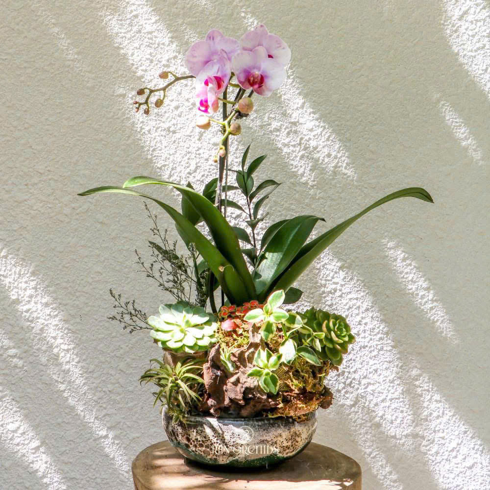 Lan Tịnh Thái là biểu tượng của sự bình an, hạnh phúc và niềm vui trọn vẹn. Chậu hoa kết hợp hài hòa giữa lan, sen đá, gỗ lũa và sao tím, tạo nên vẻ đẹp trang nhã và thanh thoát. Điểm nhấn từ chậu lan sinh nhật giúp chậu hoa thêm nổi bật, tràn đầy sức sống và phù hợp làm quà tặng ý nghĩa cho mọi không gian.