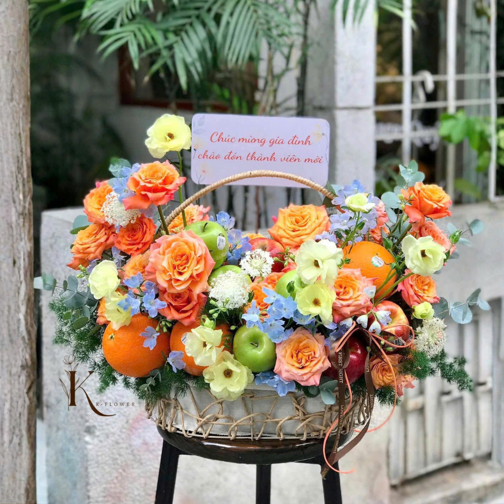 Trái cây được tuyển theo lô trong ngày, ưu tiên độ ngọt – độ giòn ổn định; hoa cắt cành tươi, dưỡng nước trước khi cắm để giữ form. Kèm gói dưỡng trái và hướng dẫn chăm (xịt ẩm hoa, đặt nơi thoáng mát, tránh nắng gắt). Ảnh chụp tại shop; khi thay thế sẽ luôn giữ tông màu – tỷ lệ – phong cách như mẫu.