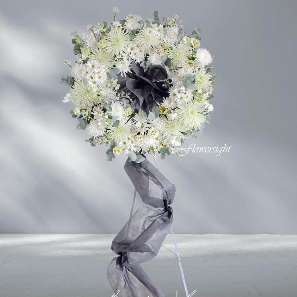 Vòng hoa tang trắng chính là lời động viên, sự sẻ chia với gia đình người đã khuất. Hoa cúc đại đoá là biểu tượng của sự tôn kính và niềm an ủi, gửi gắm lời cầu nguyện cho người đã ra đi được thanh thản, yên bình. Cúc rosy và cát tường trắng nhẹ nhàng, dịu dàng, như lời nhắc nhở rằng người đã khuất sẽ mãi sống trong lòng những người thân yêu.