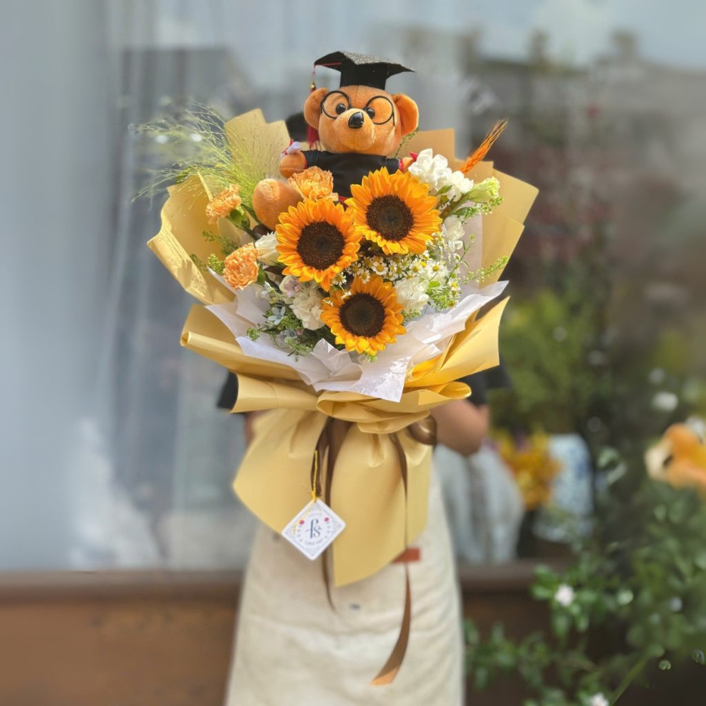 “Liberties” mang tinh thần tự do đúng như tên gọi. Sắc vàng ấm của hướng dương dẫn ánh nhìn ngay từ khoảnh khắc đầu, tiếp đó là chất mềm mượt của cát tường tông pastel và những cánh daisy nhỏ xinh điểm sáng nhịp nhàng. Gấu bông được đặt ở vị trí tiền cảnh vừa đủ cao để tạo chiều sâu, vừa đủ gần để gợi sự thân thiện. Cỏ suối với form mềm mại tạo chuyển động tự nhiên, giống như làn gió nhẹ chải qua toàn bộ bố cục, khiến tổng thể sống động mà vẫn giữ được sự an nhiên.