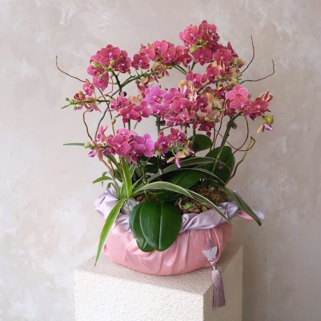 Toàn bộ chậu hoa được bọc vải lụa màu hồng nhạt, không chỉ giúp bảo vệ và cố định kết cấu, mà còn tăng thêm sự tinh tế, mềm mại cho tổng thể. Lớp lụa mang lại cảm giác nên thơ, phù hợp với những ai yêu cái đẹp nhẹ nhàng và sâu lắng.