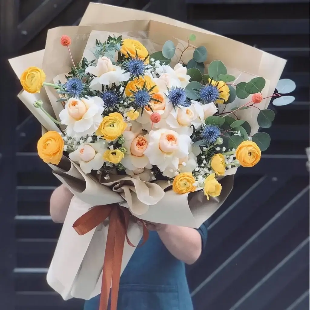 Không thể thiếu trong bó hoa là những bông hoa nhím biển độc đáo và cúc nút nhỏ nhắn. Hai loài hoa này mang lại nét trẻ trung, phá cách, đồng thời cân bằng tổng thể bằng gam màu và hình khối sinh động. Tất cả hòa quyện tạo nên một thiết kế không chỉ đẹp mà còn kể một câu chuyện: về sự nâng niu, về một tình cảm đủ sâu sắc nhưng cũng đủ dịu dàng để làm rung động bất kỳ ai.