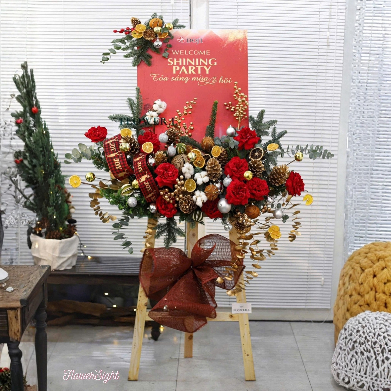 “Lucia” được xây dựng trên bảng màu đỏ – xanh – vàng kim kinh điển của mùa lễ hội. Tâm điểm là những bông ohara đỏ với cánh dày, gợn nhẹ như satin, tạo điểm nhấn ấm áp giữa nền lá thông xanh mượt. Bông gòn trắng như tuyết xen kẽ các quả châu ánh kim giúp bố cục bừng sáng, còn lát cam sấy mang sắc cam mật ong và mùi hương nhẹ, gợi không khí bếp lửa ngày đông. Dải nơ bản rộng cùng chi tiết bạc ánh (lá bạc, phụ kiện kim loại) kéo ánh nhìn từ trái sang phải, hoàn thiện cảm giác “shining party” đúng tinh thần lễ hội.