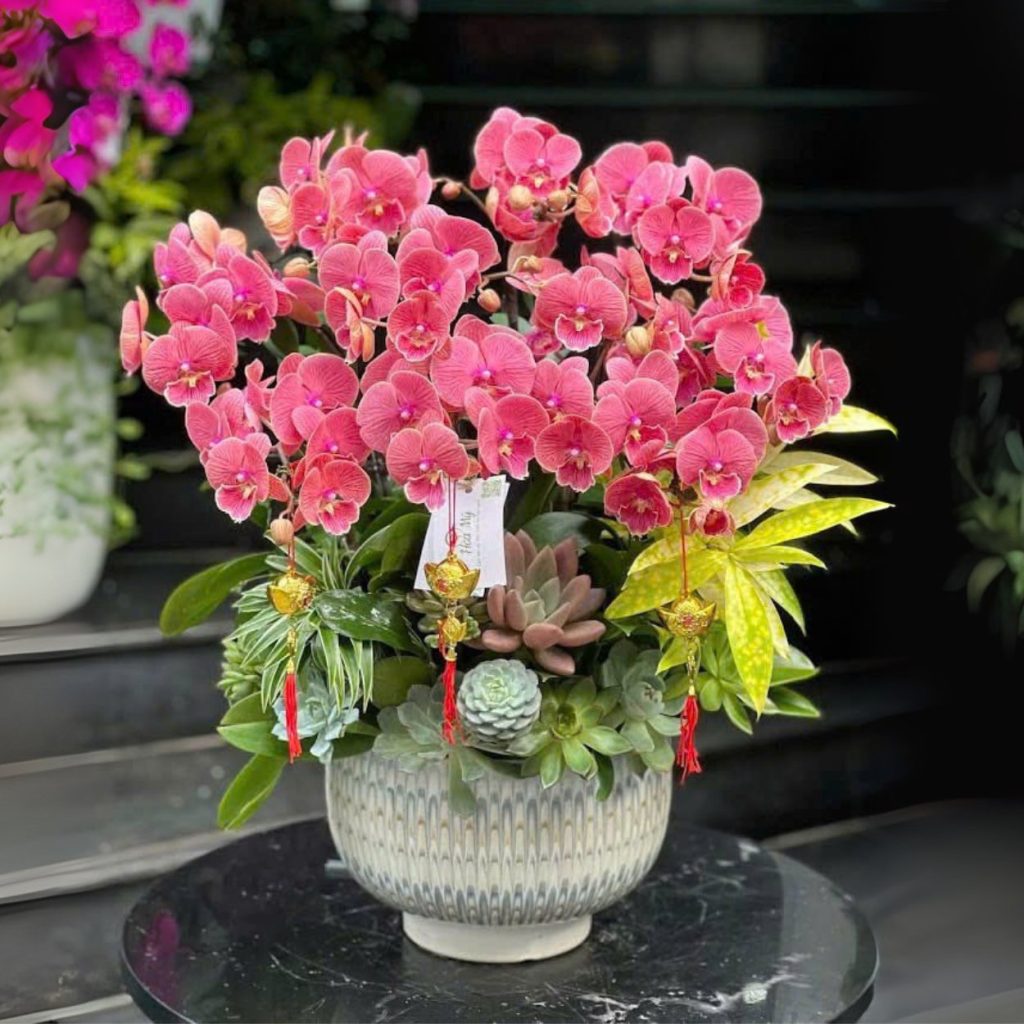 Midnight Star Orchid là sự phối hợp dịu dàng giữa những cánh lan hồ điệp hồng mềm mại, sen đá nhỏ nhắn và lá sọc tạo điểm nhấn thanh mảnh. Chiếc khánh treo nhẹ buông như lời chúc tốt lành, trong khi chiếc chậu sứ trắng làm nền cho tất cả bừng sáng. Tổng thể chậu hoa tuy nhỏ nhưng gợi nhắc đến hình ảnh lan điệp rừng – giản dị mà sâu sắc, mang cảm giác như bước vào miền ký ức thanh xuân và êm đềm.