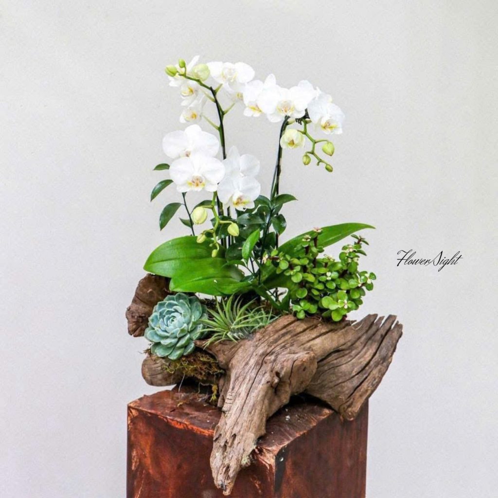 Chậu Lan Hồ Điệp Mộng ThuKhông chỉ nổi bật nhờ sự kết hợp của lan và sen đá, chậu hoa còn được đặt trên nền gỗ mộc mạc, tạo điểm nhấn gần gũi, sang trọng. Đặc biệt, sự góp mặt của lan điệp rừng mang đến cảm giác vừa tự nhiên vừa phóng khoáng, giúp tổng thể thêm cuốn hút. Từng chi tiết nhỏ đều hòa quyện, khiến chậu hoa trở thành món quà hoàn hảo trong nhiều hoàn cảnh.
