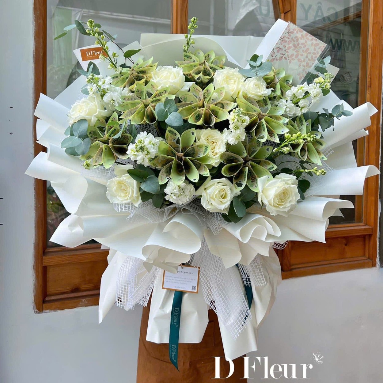 Mưa của trời mây gây ấn tượng bởi thiết kế thanh lịch và tinh tế với sắc trắng chủ đạo. Hoa hồng trắng hòa cùng lá phụ xanh nhẹ nhàng, dây nơ xanh nổi bật trên nền giấy gói và lưới bọc trắng thuần khiết. Chi tiết tiền 100k khéo léo gắn kết như lời chúc sung túc và may mắn.