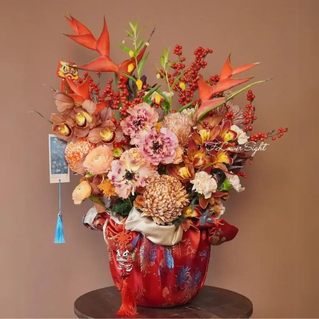 Mỗi kệ hoa Mừng Xuân Phát Tài không chỉ là một tác phẩm nghệ thuật, mà còn là lời chúc phúc đầu năm đầy trang trọng. Sắc đỏ rực rỡ kết hợp với form dáng vững chãi như thể hiện mong muốn về sự nghiệp hanh thông, tài lộc dồi dào.