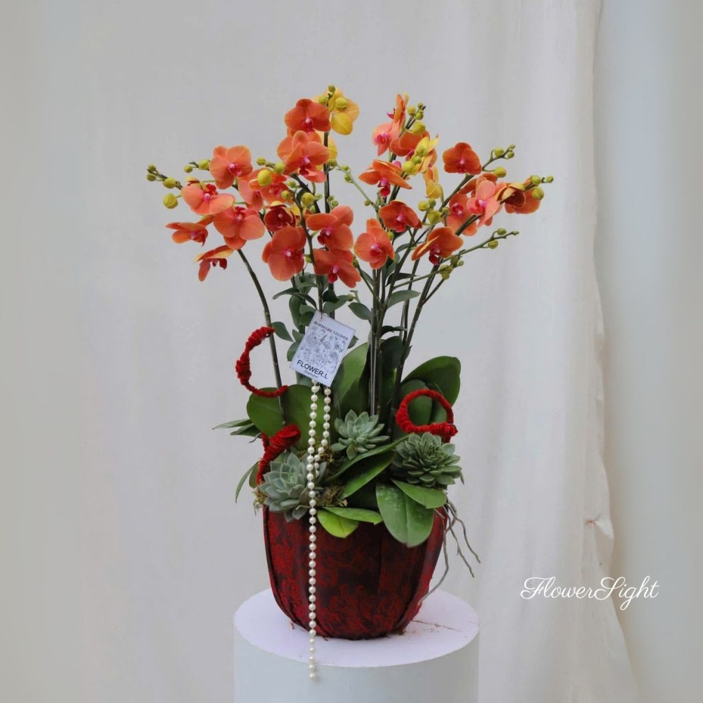 Ngọc Hoa Tình là sự kết hợp tinh tế của lan, dây ngọc, sen đá và lá chanh, mang hơi thở của tình yêu và hạnh phúc. Bó hoa này không chỉ là quà tặng mà còn là lời thì thầm của trái tim, đem đến niềm vui và sự gắn kết trong những khoảnh khắc đáng nhớ của cuộc sống.