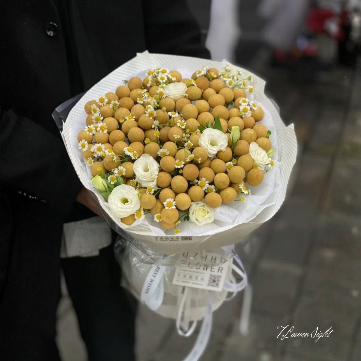 Nhãn là món quà tinh tế gồm quả nhãn tươi, hoa hồng trắng và hoa cúc dại, trang trí bằng giấy gói trắng, giấy bóng kính và dây nơ trắng. Sản phẩm thích hợp mừng tốt nghiệp, sinh nhật, quà tri ân sếp, hoặc tặng mẹ và vợ dịp 8/3, 20/10, mang đến niềm vui, sự ngọt ngào và cảm xúc ấm áp.