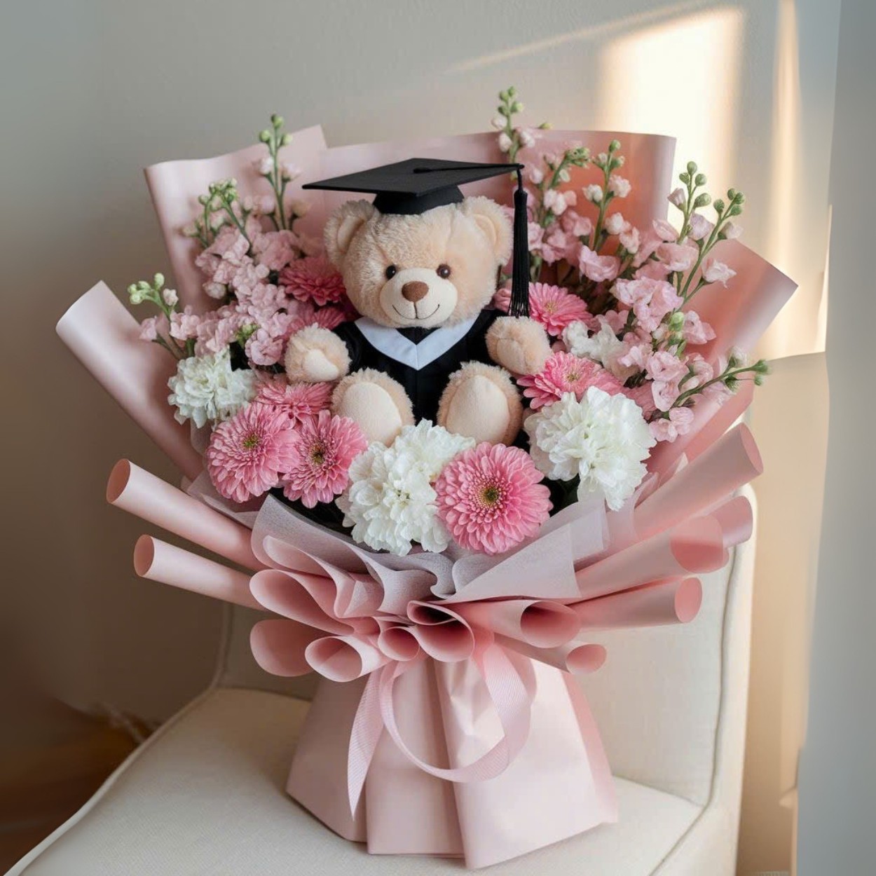 Trung tâm là gấu bông – nhân vật truyền tải cảm xúc. Bao quanh, đồng tiền kép (cánh nhiều lớp) tạo mặt phẳng điểm nhấn khoẻ khoắn, như những “đĩa sáng” lan toả hy vọng. Cẩm chướng trắng đảm nhiệm vai trò “đệm mây” – kết cấu cánh xếp dày, làm mềm rìa bó và nối nhịp các lớp hoa. Phi yến vươn cao, tạo trục dọc thanh mảnh giúp tổng thể thoáng, có chiều sâu, và đẹp ở mọi góc xoay 360°. Bố cục tuân theo nguyên tắc focus–balance–breathing space: điểm nhìn rõ ràng, cân bằng khối, có khoảng thở để đôi mắt nghỉ.