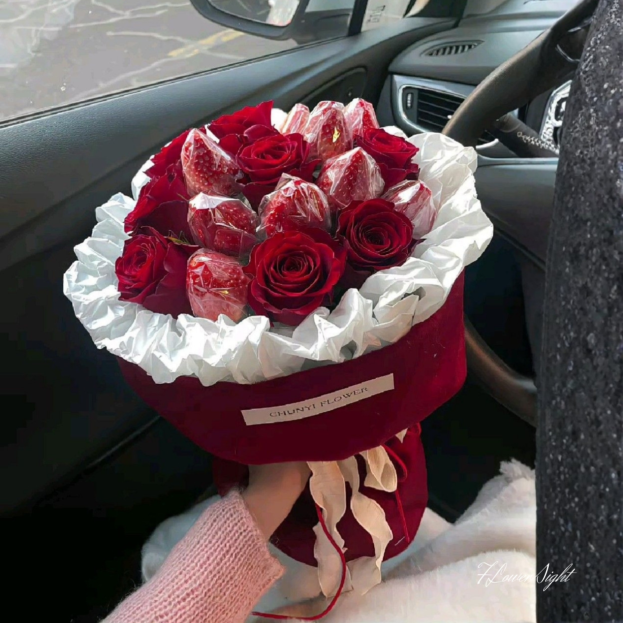 Bố cục hoa theo vòng tròn đồng tâm, đo ni đóng giày cho dáng tay khi cầm. Hồng Ecuador cánh dày, form chuẩn, cắm theo nhịp cao thấp tự nhiên để từng bông đều “có tiếng nói”. Dâu tây được bọc gọn, giữ độ tươi và độ bóng, đặt xen kẽ như các nốt nhạc đỏ ngọt ngào. Nếu ví bó hoa là một bản giao hưởng thì hồng là giai điệu chủ lực, còn dâu tây là những điểm solo ngọt sắc khiến người nhận nhớ mãi.