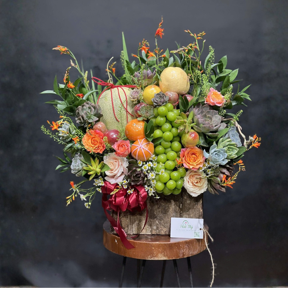 Ngay khi mở nắp thùng gỗ mộc, “O’Sullivan” chào bạn bằng một cụm nho xanh rủ xuống như thác, dẫn mắt về trung tâm; hai bên là cam quýt căng mọng được điểm thắt dây thủ công, xen kẽ lê vàng, hồng táo và quả dưa gang lưới buộc chỉ đỏ tạo nhịp tương phản. Những đoá hồng cam – nude được “đệm” bởi sen đá và cỏ đồng tiền màu lửa, thêm lá phụ xanh bản lớn – tất cả đặt trên mặt gỗ thô, kết lại bằng chiếc nơ rượu vang satin.