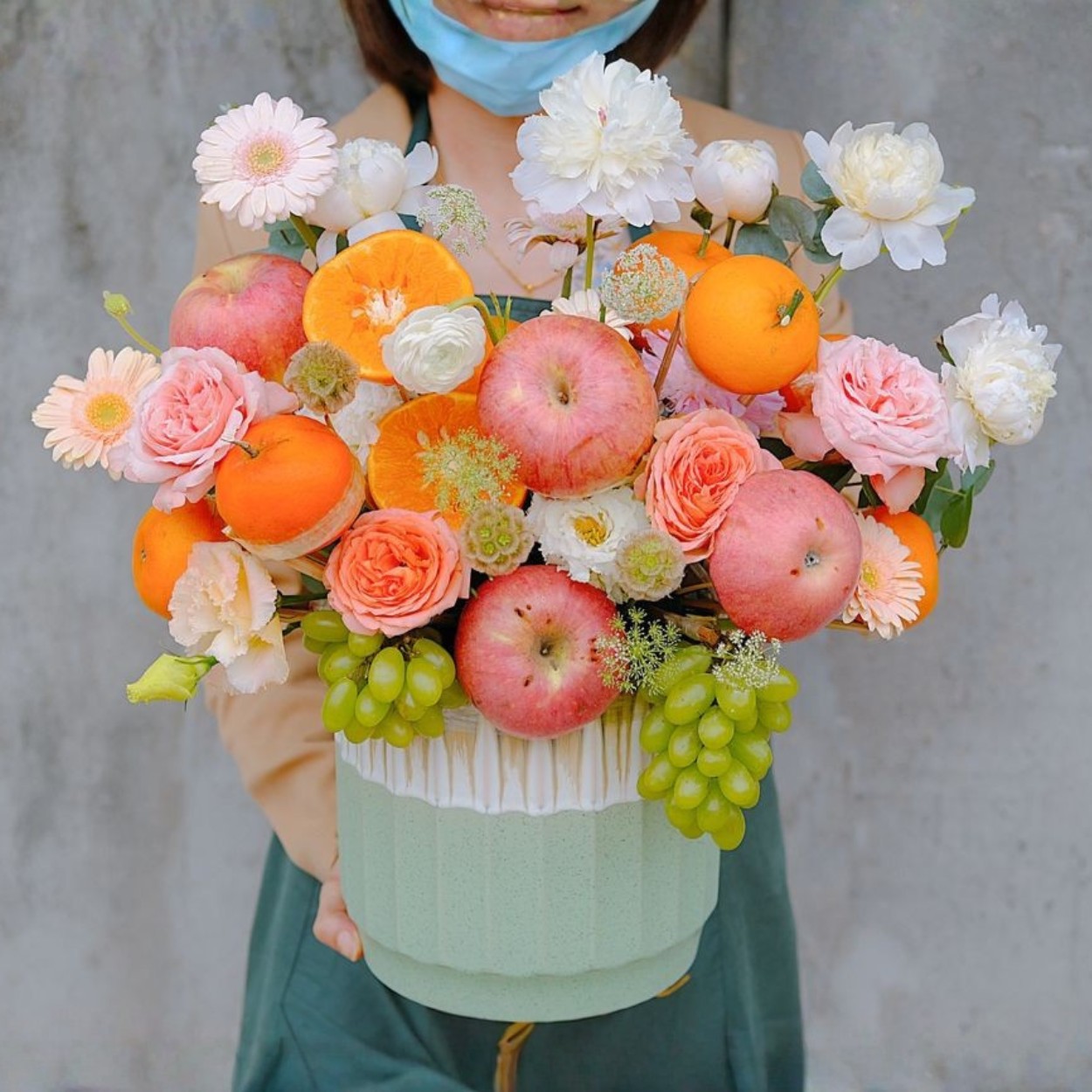 Trái cây được vệ sinh khô bề mặt, xử lý cuống để giữ tươi lâu. Toàn bộ được ghim cố định bằng que gỗ thực phẩm và foam ngậm nước an toàn. Hoa O’hara có hương thơm nhẹ, được đặt ở cao độ vừa đủ để không lấn át trái. Đồng tiền dùng vai trò bắt sáng, cẩm chướng lấp rỗng các khoảng trống giúp tổng thể đầy nhưng vẫn thoáng. Lá phụ tiết chế để nhấn sự thanh sạch của sắc xanh tự thân trái cây. Hộp xanh vân mờ đóng vai trò chiếc bệ bình yên, cân bằng sắc nóng của cam và hồng, đồng thời tạo cảm giác mát mắt khi đặt trong bất kỳ không gian nào.