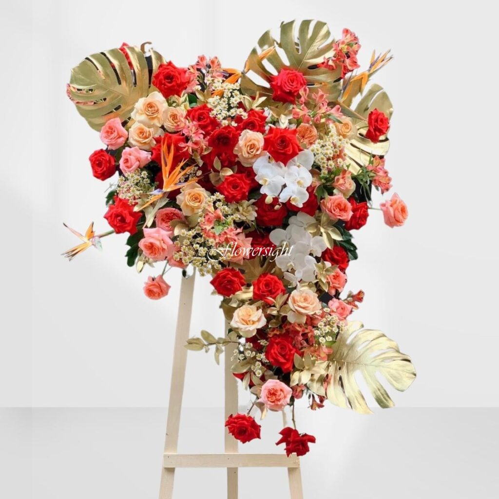 Mỗi sự kiện khai trương là cột mốc đánh dấu một khởi đầu quan trọng. Trong giây phút ấy, Kệ hoa chúc mừng Phát Tài như một lời chúc đầy năng lượng tích cực, mang đến sự may mắn, phát đạt và thịnh vượng. Thiết kế sang trọng, màu sắc rực rỡ cùng thông điệp tốt lành khiến kệ hoa này trở thành tâm điểm nổi bật tại bất kỳ buổi lễ nào. Mang gam màu đỏ chủ đạo – biểu tượng của tài lộc và thành công, kết hợp hoa lan vàng, hồng môn, đồng tiền, kệ hoa tạo nên một bố cục mạnh mẽ, tươi sáng và hài hòa. Đây là món quà tuyệt vời để gửi đến đối tác, bạn bè hoặc người thân nhân dịp khai trương cửa hàng, doanh nghiệp, văn phòng…
